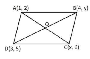 Hence for parallelogram with vertices at A(1, 2), B(4,y), C(x, 6) and D(3, 5)