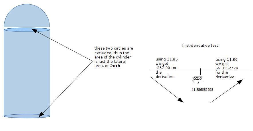 ![\bf \textit{now, let's check the critical points}\\\\ \cfrac{dc}{dr}=-\cfrac{28000}{r^2}+\cfrac{16\pi r}{3}\implies \cfrac{dc}{dr}=\cfrac{16\pi r^3-84000}{3r^2} \\\\\\ 0=\cfrac{16\pi r^3-84000}{3r^2}\implies 84000=16\pi r^3\implies 5250=\pi r^3 \\\\\\ \boxed{\sqrt[3]{\cfrac{5250}{\pi }}=r}](https://tex.z-dn.net/?f=%5Cbf%20%5Ctextit%7Bnow%2C%20let%27s%20check%20the%20critical%20points%7D%5C%5C%5C%5C%0A%5Ccfrac%7Bdc%7D%7Bdr%7D%3D-%5Ccfrac%7B28000%7D%7Br%5E2%7D%2B%5Ccfrac%7B16%5Cpi%20r%7D%7B3%7D%5Cimplies%20%5Ccfrac%7Bdc%7D%7Bdr%7D%3D%5Ccfrac%7B16%5Cpi%20r%5E3-84000%7D%7B3r%5E2%7D%0A%5C%5C%5C%5C%5C%5C%0A0%3D%5Ccfrac%7B16%5Cpi%20r%5E3-84000%7D%7B3r%5E2%7D%5Cimplies%2084000%3D16%5Cpi%20r%5E3%5Cimplies%205250%3D%5Cpi%20r%5E3%0A%5C%5C%5C%5C%5C%5C%0A%5Cboxed%7B%5Csqrt%5B3%5D%7B%5Ccfrac%7B5250%7D%7B%5Cpi%20%7D%7D%3Dr%7D)