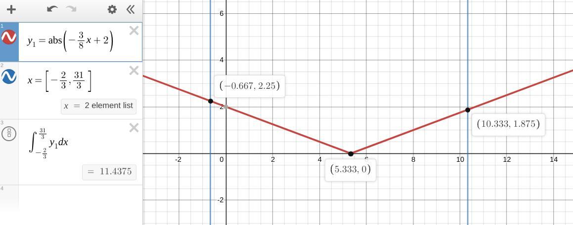 The integration resolves into finding the area of two triangles. The left has a height of (-3/8(-2/3)+2) = 2 1/4, and a width of (16/3-(-2/3)) = 6. Then its area is ...