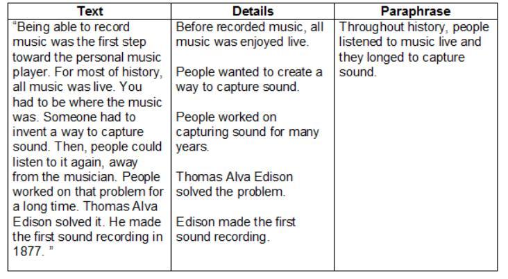 Paraphrasing is rewriting in your own words what has been read or learned without distorting the main meaning. According to the information in the table, it can be inferred that the sentence that best completes the paraphrase of the passage is A. "In 1877, Thomas Alva Edison solved the problem of capturing sound when he made the first sound recording" because It includes all the details and the appropriate supplementary information to summarize all the topics covered in the text that were not mentioned in the paraphrase chart incluiding the name of the inventor and the year. So the answer is A.