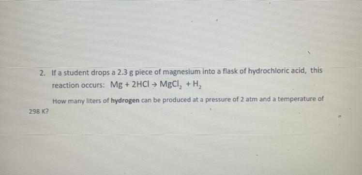 Answer: A volume of 1.16 L hydrogen is produced at a pressure of 2 atm and a temperature of 298 K.