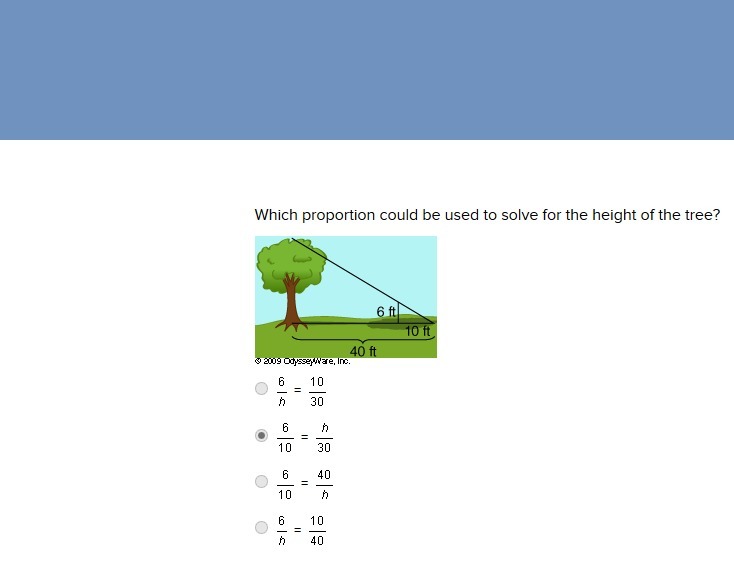 The small triangle has a vertical side that measures 6 ft. That side corresponds to the height of the tree, h, in the large triangle.