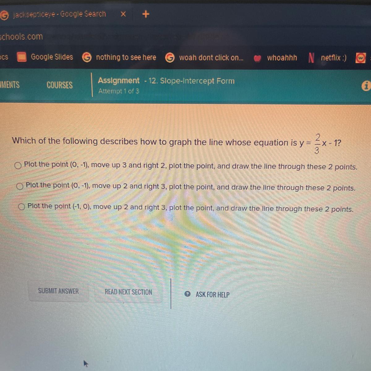 We then would move up 2 and right 3 units because that represent our slope. So the second option.