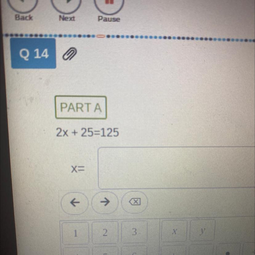 So the equation is 2x+25=125. you first subtract the 25 from the 125 which you'll get 100 and then divided by 2 which leaves the x alone and so 100/2 = 50 so x= 50