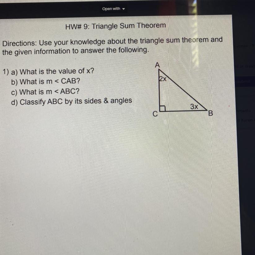 The Triangle Sum Theorem states that the interior angles of a triangle add up to 180 degrees. A square for an angle symbolizes that the angle is 90 °, as is the case with angle ∠ACB.
