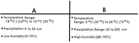 a t-chart with one column labeled A listing: Temperature Range: -18 degrees Celsius (-0.4 degrees Fahrenheit) to 10 degrees Celsius (50 degrees Fahrenheit), Precipitation: 0 to 50 cm, Low humidity (0-10%);and another column labeled B listing: Temperature Range: 2 degrees Celsius (35 degrees Fahrenheit) to 24 degrees Celsius (75 degrees Fahrenheit), Precipitation Range: 25 to 200 cm, High humidity (80-90%)