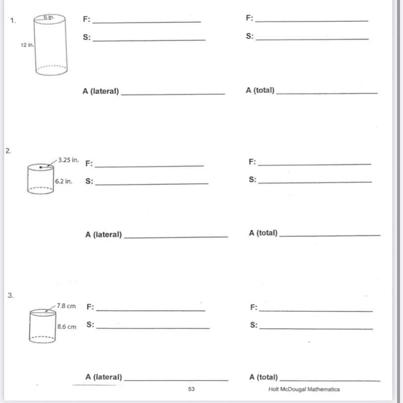 Lateral area = 2πrh = 6.5π×6.2 = 40.3π in²