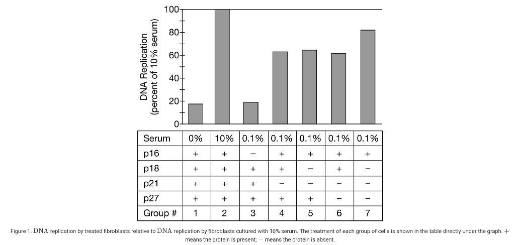 The scientists divided serum-starved fibroblasts into groups to which they added no serum, 10% serum, or 0.1% serum. Each of the groups with 0.1% serum was also treated to block the production of only one or combinations of four proteins (p16, p18, p21, and p27) that are inhibitors of cyclin-dependent kinases. The scientists grew the fibroblasts for 48 hours and then measured the amount of DNA replication taking place to determine whether the cells had reentered the cell cycle. The scientists compared each group of cells to the group cultured with 10% serum and plotted the data (Figure 1).