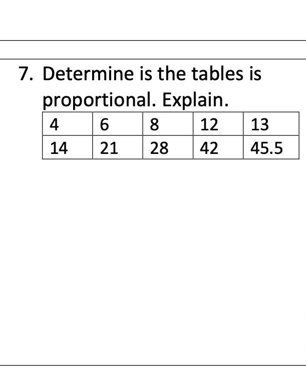 Notice that there is a constant change in y and a constant change in x. But by how much? Given the last point (13,45.5) we can see that 13-12=1 and 45.5-42=3.5 so that means as x increases by 1, y always increases by 3.5, making the relationship proportional. You can also write the equation y=3.5x to show this