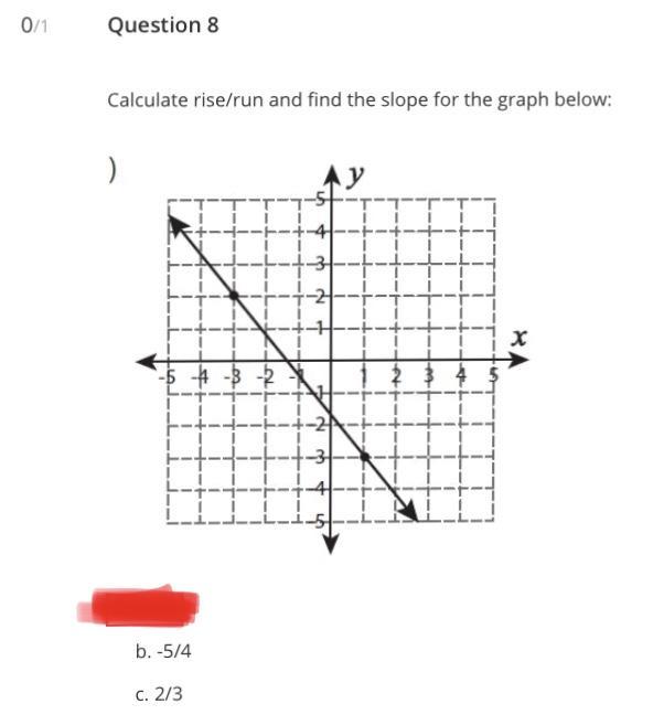 Question 8:B Question 5:C For question 8, you want to can’t how much it rises first and how many spaces you have to go over second. When ever you count the amount of spaces to move horizontally you always count left to right. So you start at the point furthest to the left, and since that point is higher instead of counting up to the next point you have to count down, which means it is going to be a negative number. You count down 5 spaces, and then right 4 spaces to get to the next point which means the slope is -5/4. For question 5, it is the same concept so from the left point you have to go down 2 and over 8, which makes the slope -2/8 but you have to simplify it to make it -1/4. The y-intercept is -1.5 because that is where the line crosses the y-axis
