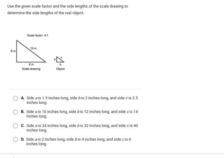 A. Side <em>a </em>is 1.5 inches long, side <em>b </em>is 2 inches long, and side <em>c</em> is 2.5 inches long.