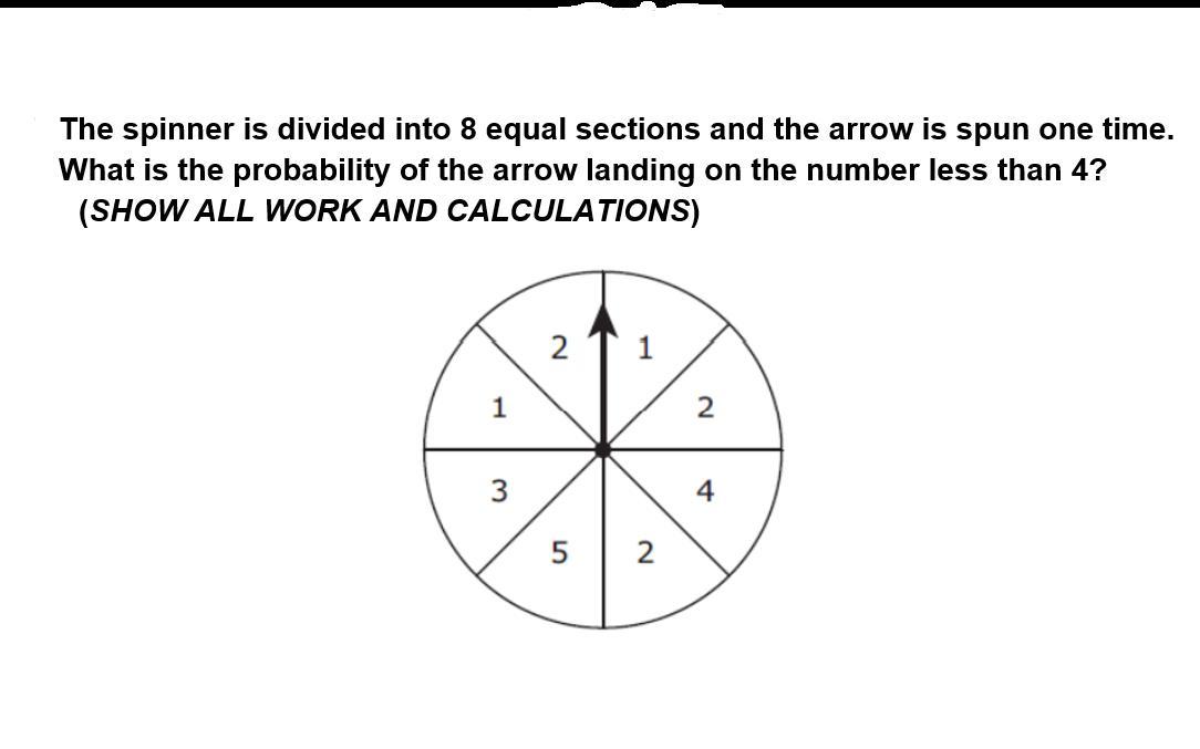 Well there are 8 possibilities every time you spin. The chance is 6/8 that you land on a number less than 4, if you spin it once (since 6 out of the 8 possibilities are less than 4). So you just have to divide 6/8 which is 0.75. Multiply by 100 (move the decimal over 2 times to the right) to get the percentage which is 75%.