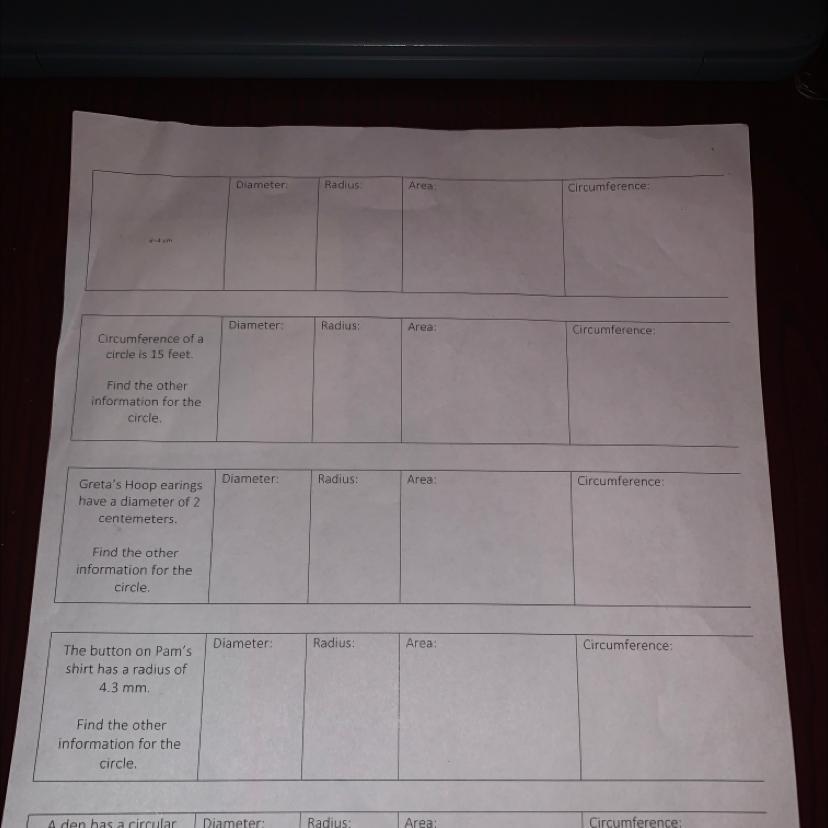 <h2>Therefore, </h2><h3>Diameter = 4.76 feet</h3><h3>Radius = 2.38 feet</h3><h3>Area = 17.78 ft²</h3><h3>Circumference = 15 feet</h3>