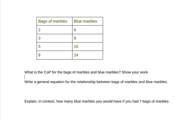 Each number on the left side is multiplied by 3. There are 3 blue marbles in each bag. 7 bags will have 21 blue marbles. 7*3=21
