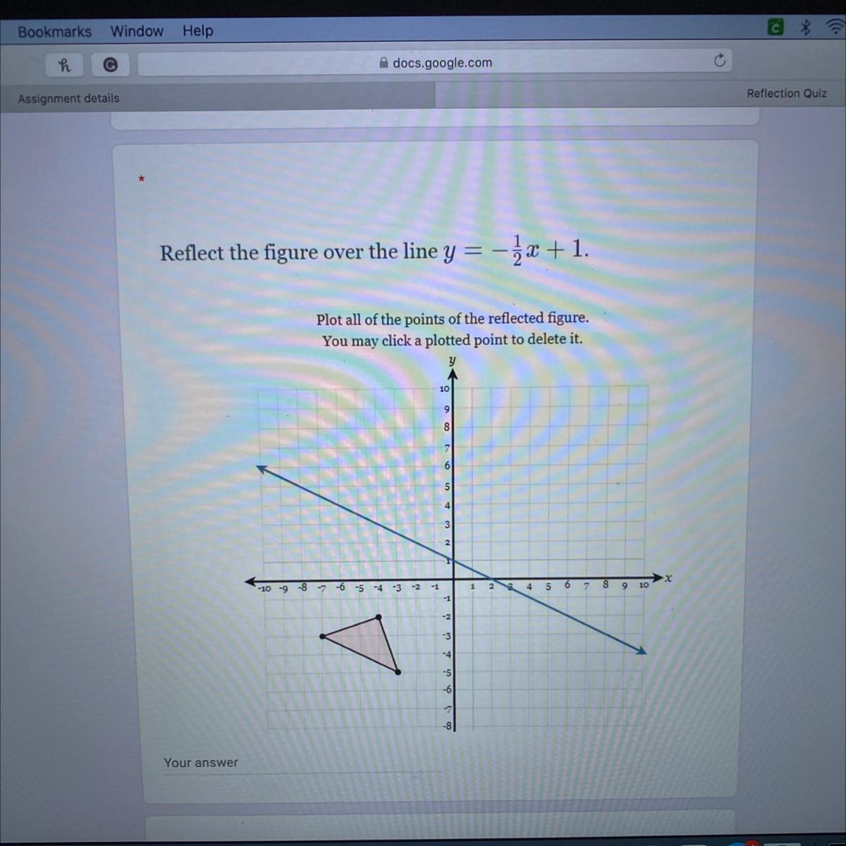 If you want to do this algebraically, the formulas for finding the reflected points are given in the second attachment. For the given line, these become ...