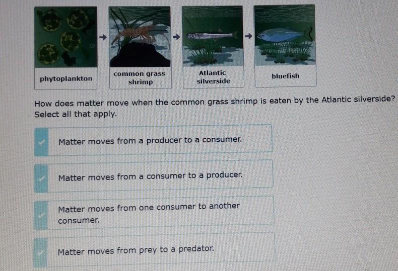 The common grass shrimp feeds on the phytoplankton, which makes it a consumer. Then, the Atlantic silverside feeds on the shrimp, which means that it is also a consumer. This means that matter moves from one consumer to another.