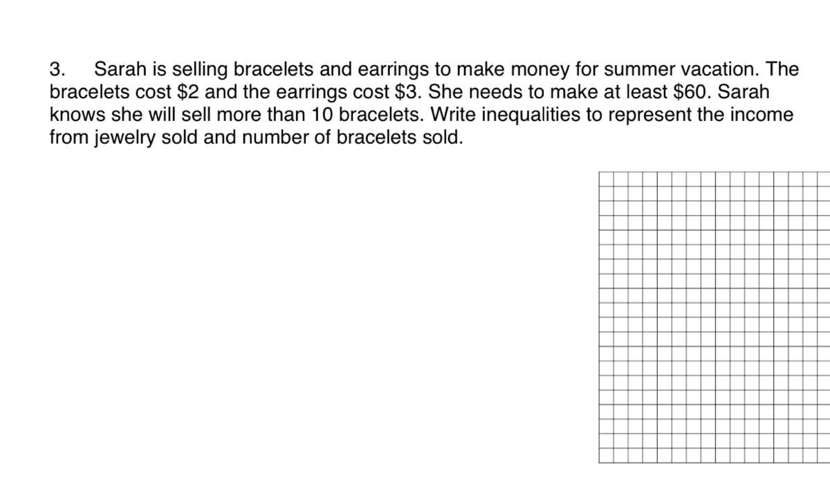We know that she will be selling bracelets for $2 each and earrings for $3 each. That means we will have 2x+3y, where x is the number of bracelets she sells and y is the number of earrings she sells. Then we will have