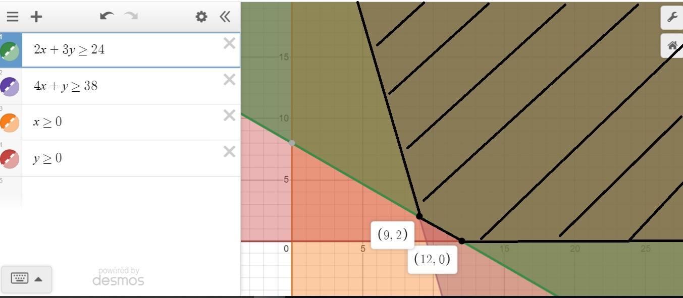 To find the minimum value of C evaluate the vertices (9,2) and (12,0) of the solution area in the objective function