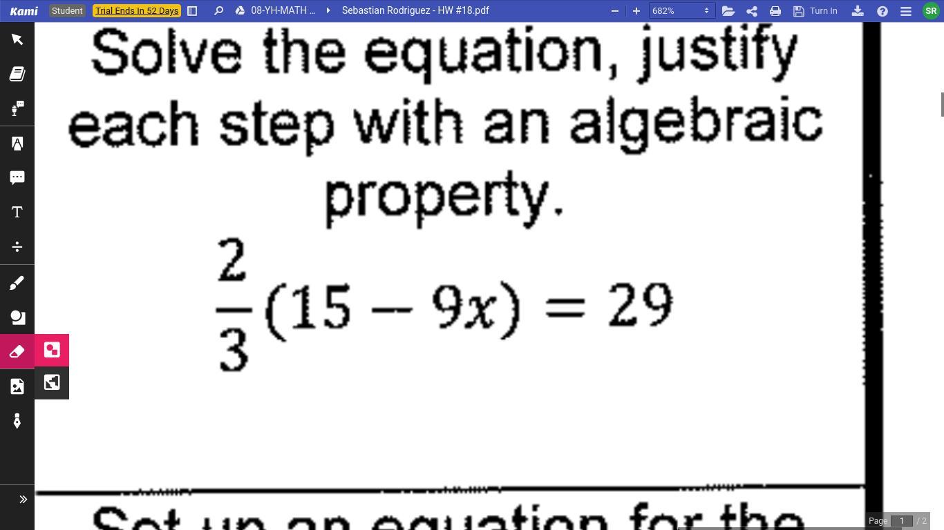 The final answer is x = -19/6. The first step is to reduce the expression to 2/3 * 3(5-3x)= 29. This will make the equation much easier. The next step is to simplify by cancelling out the 3 in 2/3 with the 3 multiplying 5-3x so it leaves you with 2(5-3x)=29. Then you would remove the parenthesis by using the distributive property and simplifying 2(5-3x) to 10-6x= 29. Then subtract 10 from both sides, which leaves you with -6x = 19. Divide by -6 on both sides and you get x= -19/6. Hope this helps