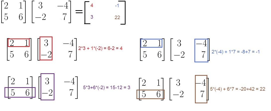 Notice how I'm marking the rows and columns, and then multiplying the corresponding values together. Also make note of the color-coding.