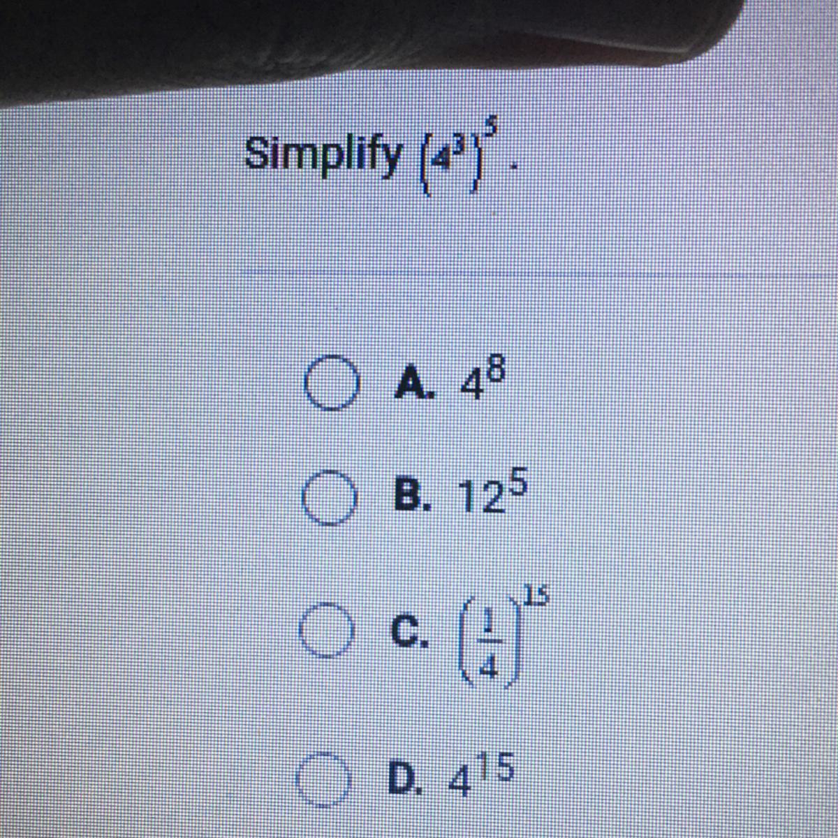PLEASE HELP!!!!!!!!!!!!!!!! simplify (4^3)^5
