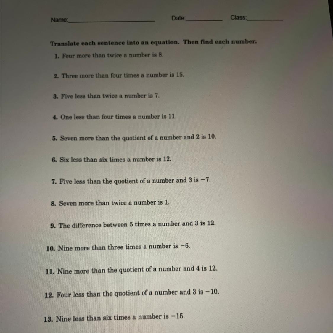 13. Nine less than six times a number is -15.
