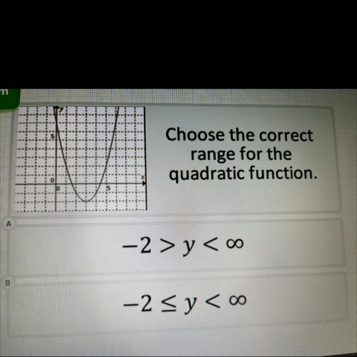 We see in the graph that the lowest y-coordinate is -2. The graph goes up from -2 on both sides all the way to infinity. The range is -2 and all values greater than -2.