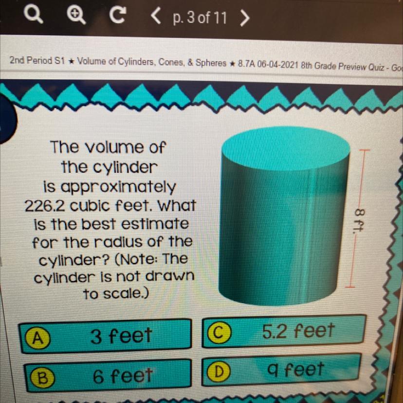 Step-by-step explanation: The formula for volume of cylinder is: V=πR²h, where R is the radius of the bottom which is the circle, h is the height of the cylinder. Hope this helps!