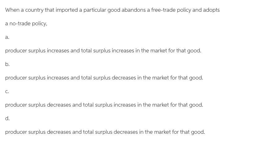 This is false. Producer surplus increases because the purple area is transferred from consumers to producers when we move from free trade to no trade.