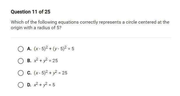 Which of the following equations correctly represents a circle centered at the origin with a radius of 5?
