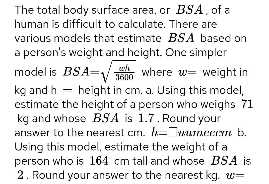 w = 75 kg ; BSA = 1.9 ; h =?
