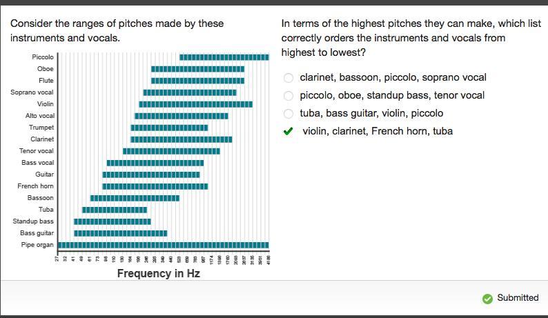 Consider the ranges of pitches made by these instruments and vocals.