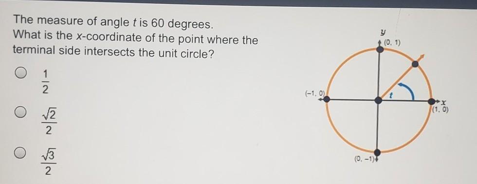 The measure of angle t is 60 degrees. What is the x-coordinate of the point where the terminal side intersects the unit circle?