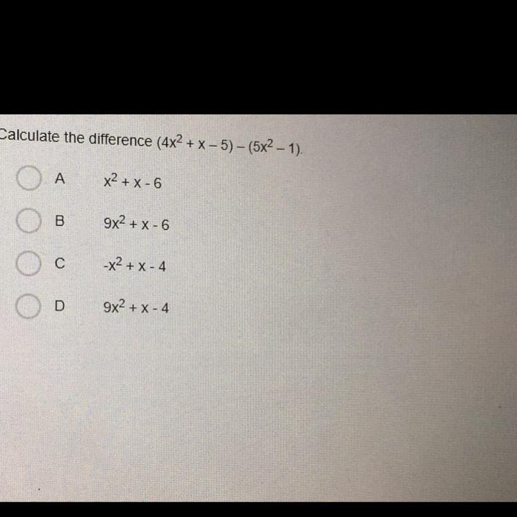 Calculate the difference (4x2 + x - 5) – (5x2 - 1).