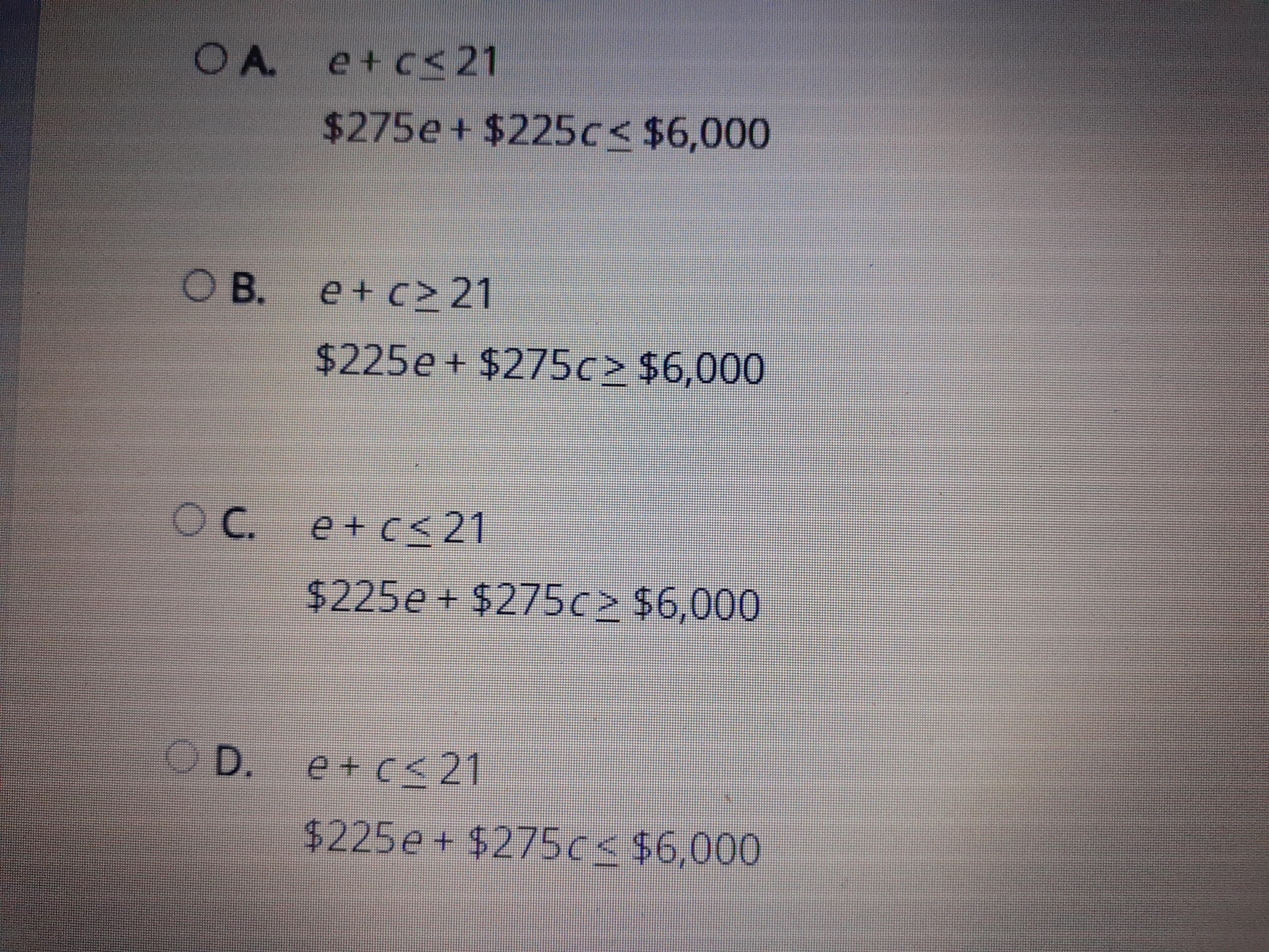 t $225 per semester hour and each core class costs $275 per semester hour. If he cannot spend more than $6,000 each semester on classes which system of any qualities below can be used is a Herman the number of elective classes e and the number of core classes c he can take each semester?
