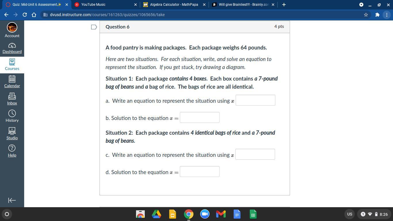 1a. To represent this situation, all of the weight for each package must be in the equation. Since each package has 4 boxes, and only the objects in one box are detailed, everything must be multiplied by 4. Now, the values that must be multiplied by 4 are a bag of rice and beans. Since the beans weigh 7 pounds, they can be represented using the constant 7, and the rice can be represented with the variable x. Combining all of this information, the equation 64(total)=4(7+x)