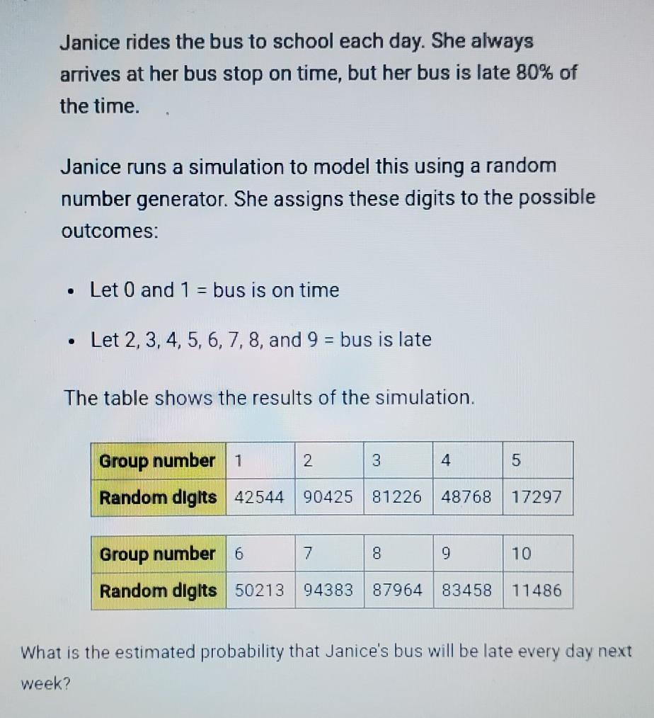runs a simulation to model this using a random number generator. She assigns these digits to the possible outcomes. What is the estimated probability that Janice's bus will be late every day next week?