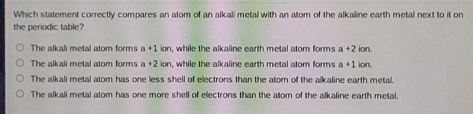 A: The alkali metal atom forms a +1 ion, while the alkaline earth metal atom forms a +2 ion.