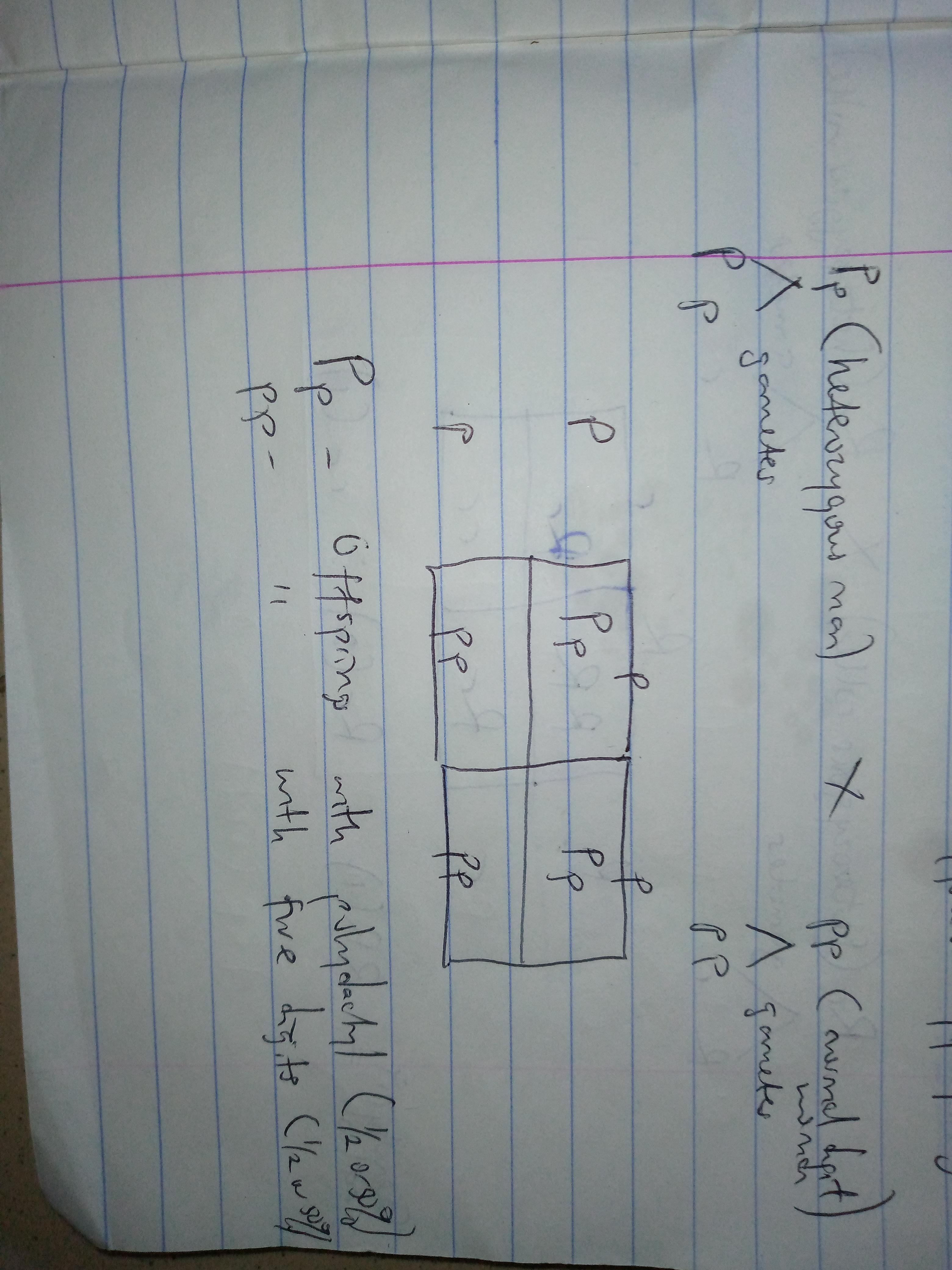 According to this question, If a man who is heterozygous (Pp) for this trait marries a woman with 5 fingers (pp), the following gametes will be produced by each parent: