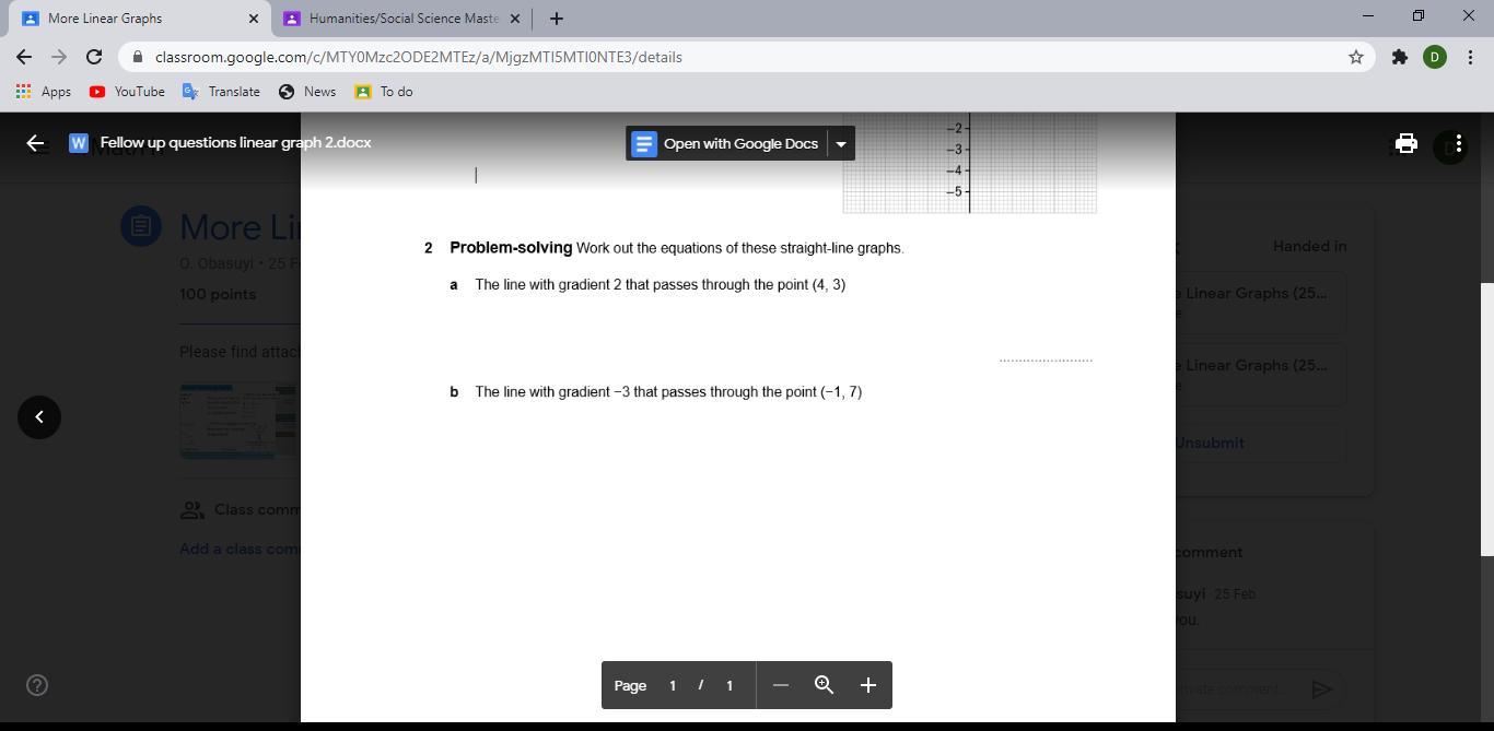 You are given the gradient and one point , which is an x and y value. Using that solve for b:
