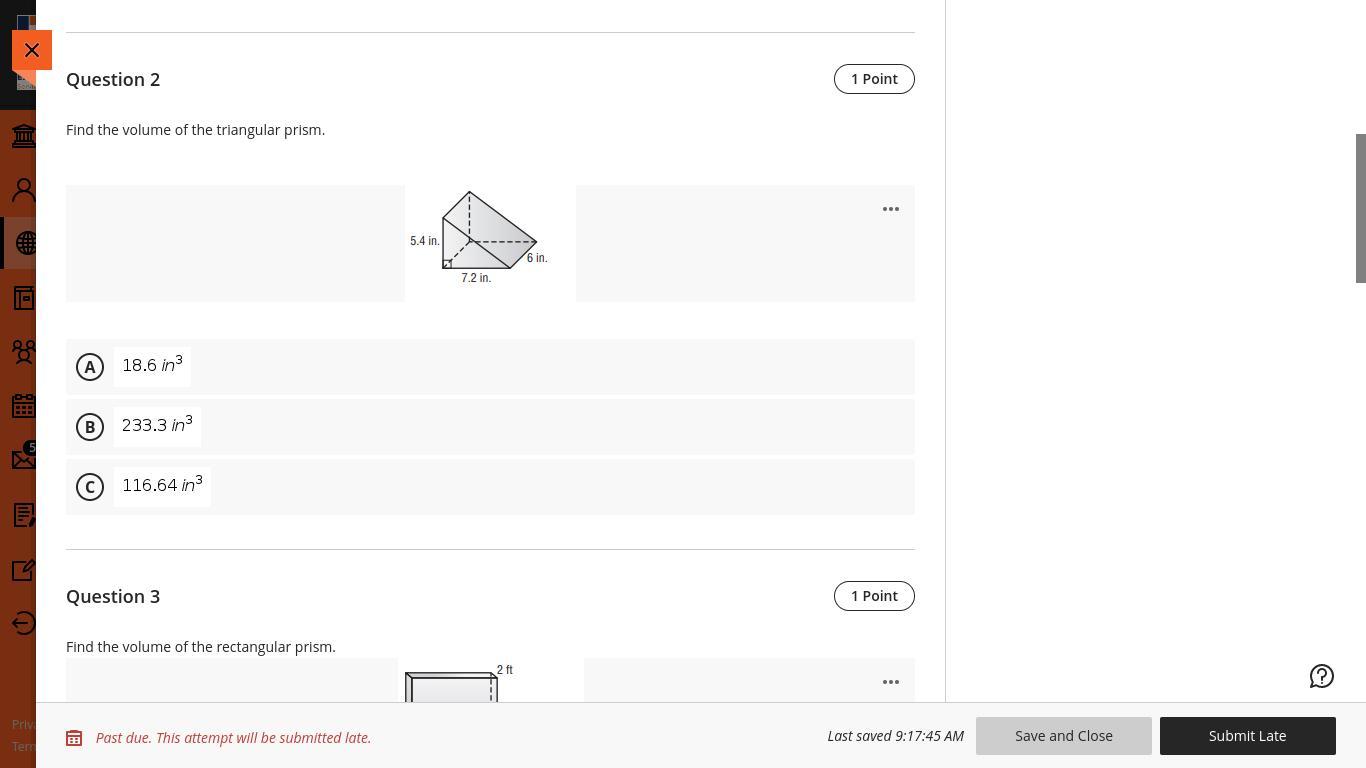 If you round to the nearest tenth place, your answer is 233.28 inches cubed . However, if you think about a triangle, the area is base times height divided by two. Similarly, you have to divide the volume by two to get your final answer. Thus, your final answer is (C) 116.64