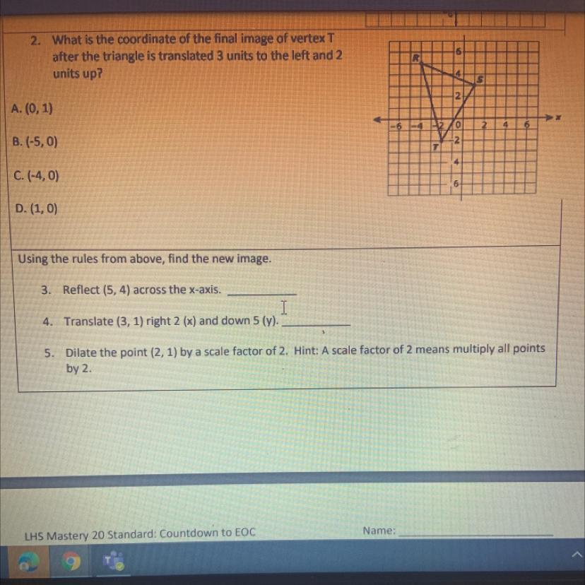 Translate just means to move, and vertex T just means the dot labeled "T". Move just that point three to he left and two to the right is (-5,0). I would give (5,-4) as the answer for three, but I'm not too sure and don't wanna spread false information... onto number 4. (3,1) and the form is (x,y) Right is positive, so ADD 2 to 3. Down is negative, so SUBTRACT 5 to 1. You now have (5,-4). 2 multiplied by 2 is 4 and 1 multiplied by 2 is 2. (4,2)