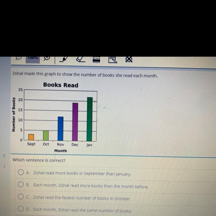 Answer: B. Each month, Zohal read more books than the month before