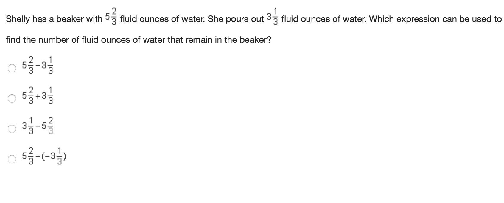We are given that Shelly has a beaker with fluid ounces of water and she pours out fluid ounces of water.