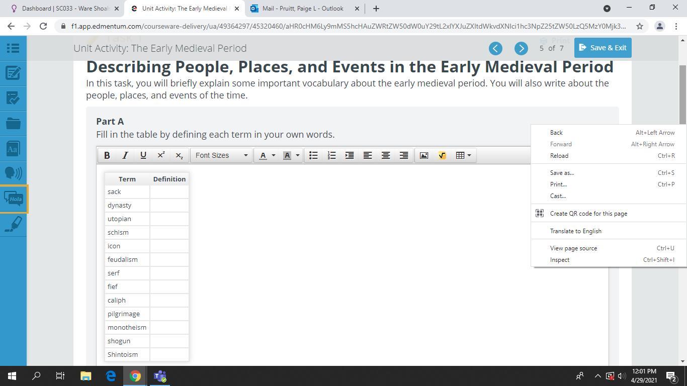 In this task, you will briefly explain some important vocabulary about the early medieval period. You will also write about the