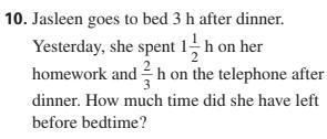 So, she would've spent <u>1 hour and 30 minutes</u> on her homework and <u>40 minutes on her telephone</u>. If you <u>add</u> those amounts up, you get <u>2 hours and 10 minutes</u>. Since she goes to bed <u>3 hours after dinner</u>, and <u>2 hours and 10 minutes have gone by</u>, you do 3 hours - 2 hours 10 minutes and you get 50 minutes.