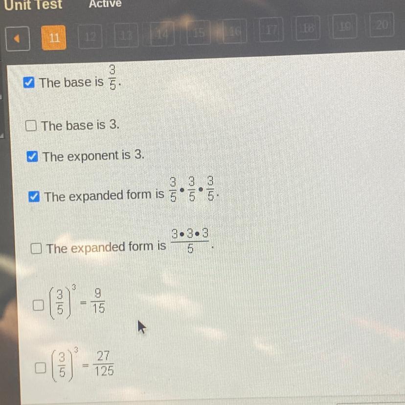 The base is 3/5, the exponent is three, the expanded form is 3/5 * 3/5 * 3/5, 3/5 to the third power is 27/125.
