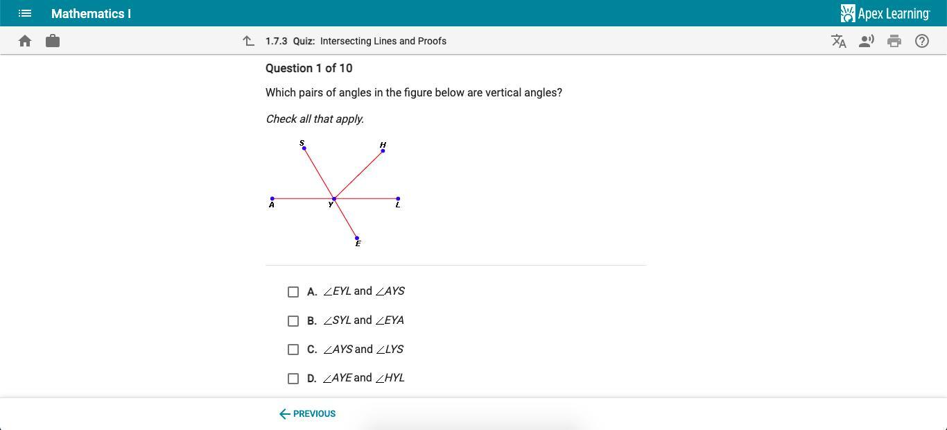 Another pair of vertical angles are <SYL and <EYA, because they are opposite when lines ES and AL cross at point Y.