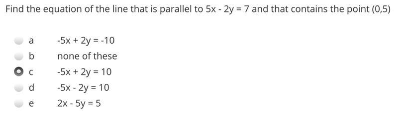 5x - 2y = -10 (B.) This should be right so if its not let me know I am stumped on what else it would be