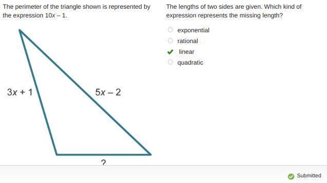 A triangle has the dimensions shown. The perimeter of the triangle would be represented by which type of expression?
